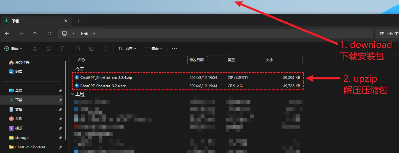 下载 ChatGPT Shortcut crx 安装包(ChatGPT_Shortcut-crx-3.x.x.zip),并解压(crx 文件在解压的文件夹里)。