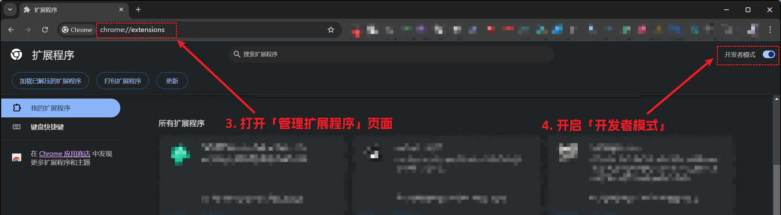 复制以下地址粘贴到浏览器地址栏,按回车打开。在页面右上角开启「开发者模式」。
