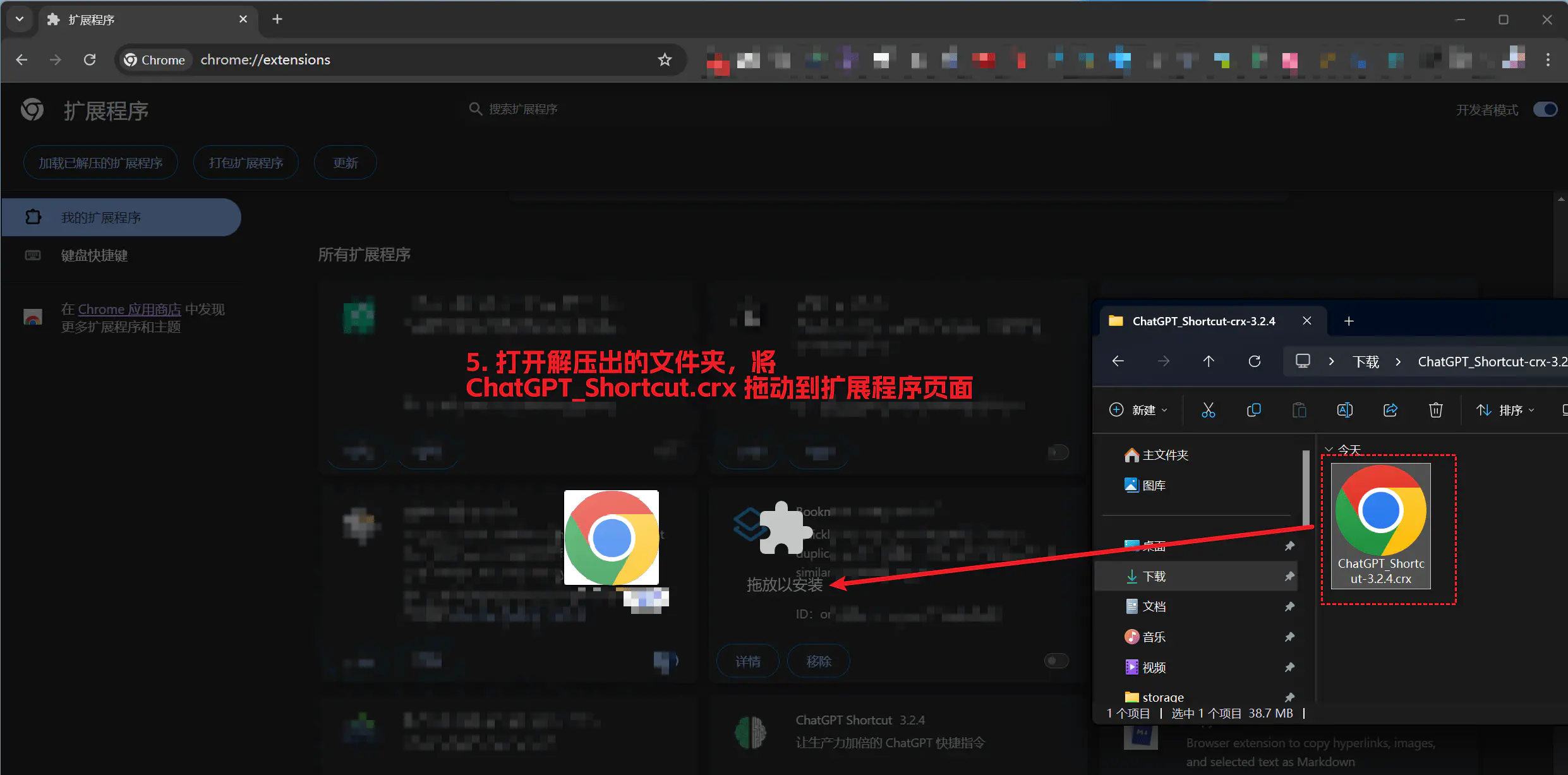 安装 ChatGPT Shortcut 插件(注意 ⚠️:需要拖入 .crx 文件,不要点击【加载已解压的扩展程序】)